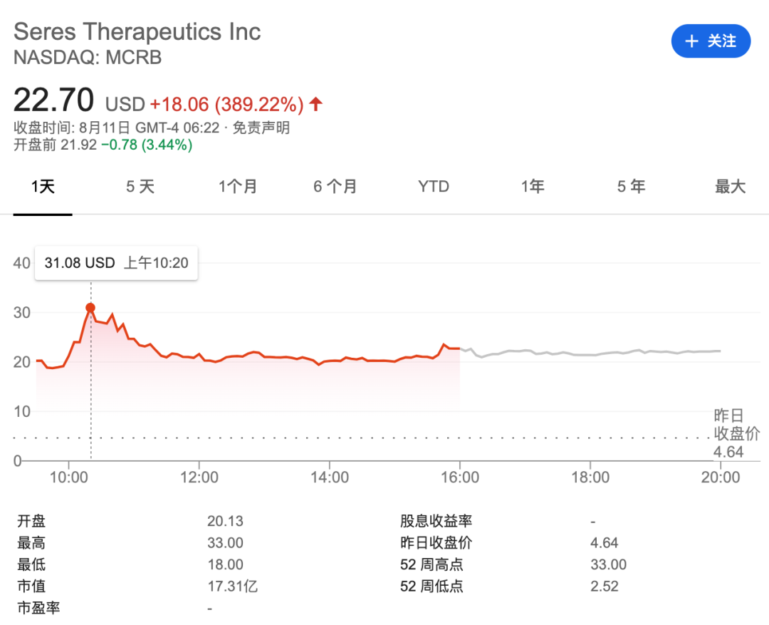 该消息一出,Seres Therapeutics 公司股价当天上涨 389%,股价一度突破 30 美元。
