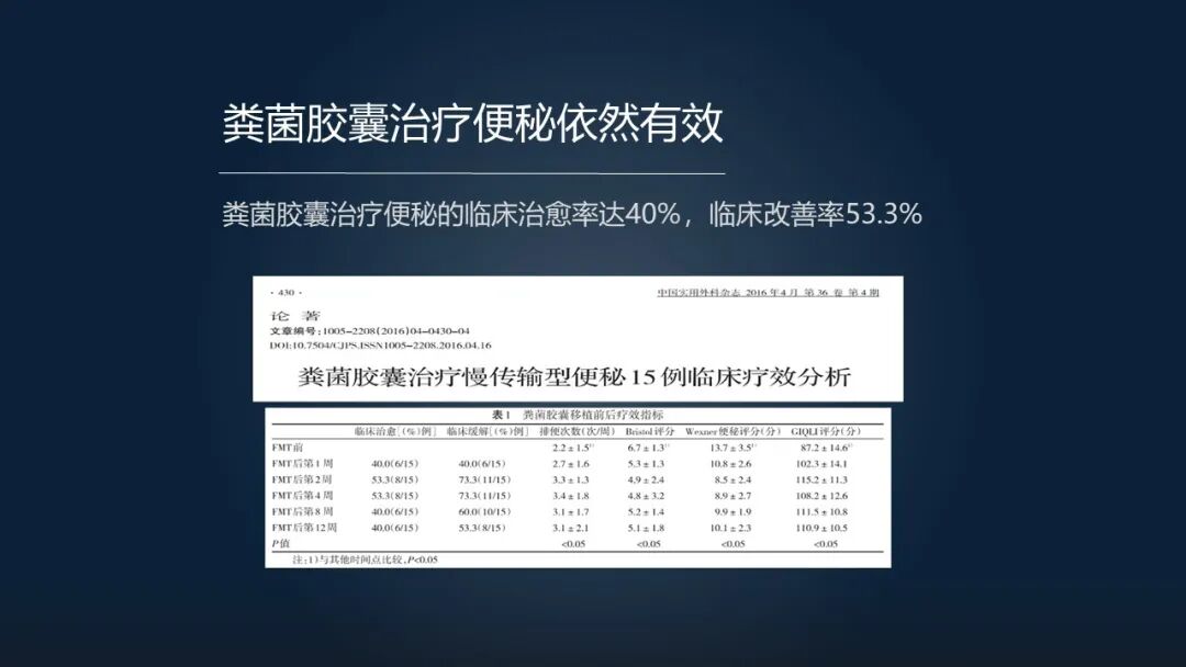 通过粪菌胶囊治疗便秘,它临床治愈率也达到 40%,它的临床改善率可以达到 53.3%。