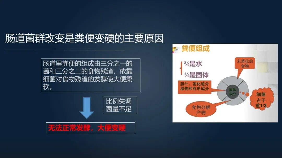 其实我们肠道里面的粪便的组成,1/3 是菌,2/3 是食物残渣。我们往往依靠肠道菌群对食物残渣的发酵使大便变软,但是工作压力或者生活习惯不良都可以造成一个人肠道的菌群不足,而无法正常发酵可以导致我们的粪便变硬。