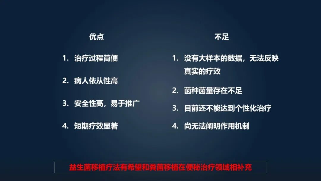 但它也存在不足之处:它没有大样本的数据,它也无法反映真实疗效;第二个就是说,它的菌种菌量和粪菌移植比还是存在不足,目前还不能达到一个个性化治疗;而且它也没有办法阐明它的作用机制。