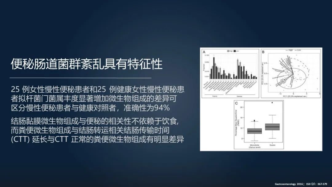 比如说,现在发现慢性传输性便秘患者肠道内一些产甲烷的梭菌的含量是明显增高的,甲烷这些代谢产物也出现一个升高,而这些甲烷梭菌和甲烷代谢产物它只和结肠传输有关,它和排便的频率、粪便粘稠度是无关的。