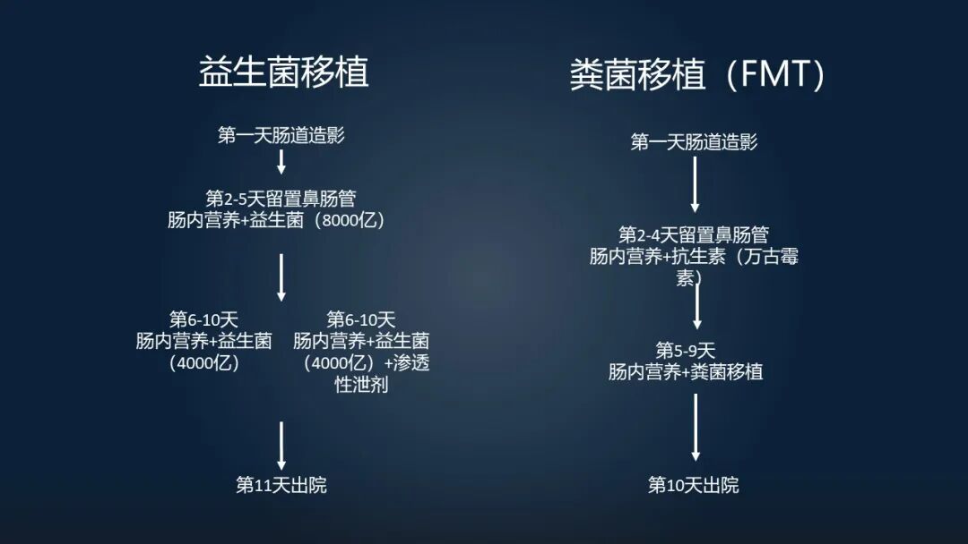 我们在第 1 天给患者进行一个肠道造影;在第 2~5 天留置胃管,给患者输入肠内营养以及服用大剂量益生菌,每天在 8000 亿的菌量;在第 6~10 天,我们在拔除胃管的同时,将益生菌的菌量逐步减少;在第11天出院。