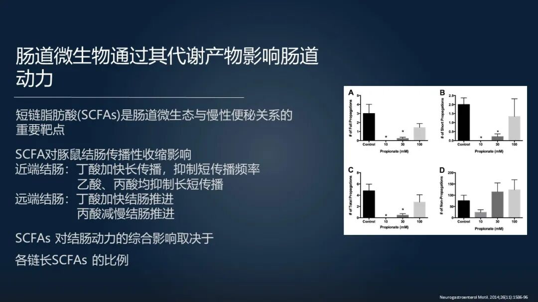短链脂肪酸在不同的结肠,在近端、远端,它不同的短链脂肪酸(包括丁酸、丙酸、乙酸)的比例不同,会影响到结肠传输的一个动力情况。