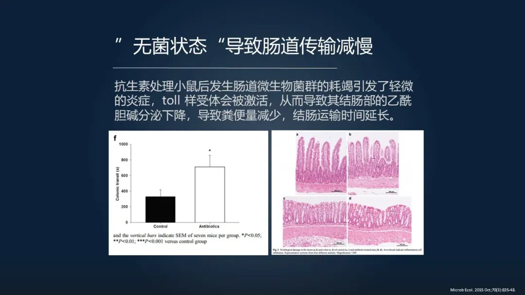 还有研究发现,在无菌状态下,无菌小鼠的肠道的传输是减慢的,我们在给小鼠使用大剂量抗生素以后,菌群的耗竭往往带来了一个 toll 样受体激活,导致粪便量减少以及结肠传输时间延长。