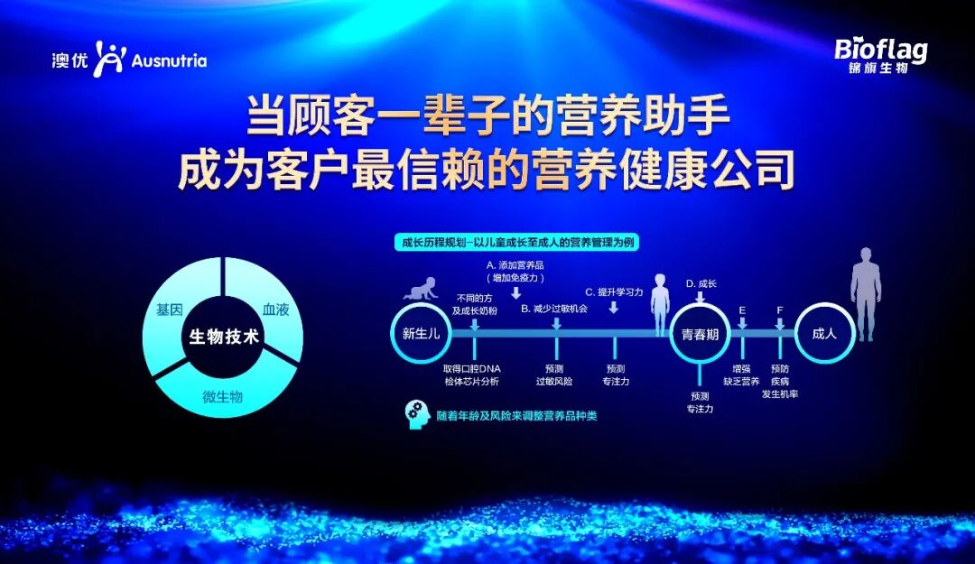 基于全生命周期的成长和健康的要求,通过生物技术,包括基因、血液、微生物等生物技术的综合应用,通过这样的一个系统手段,来打通营养与健康的闭环,为我们的消费者提供更多更全面的营养、产品和营养健康服务。