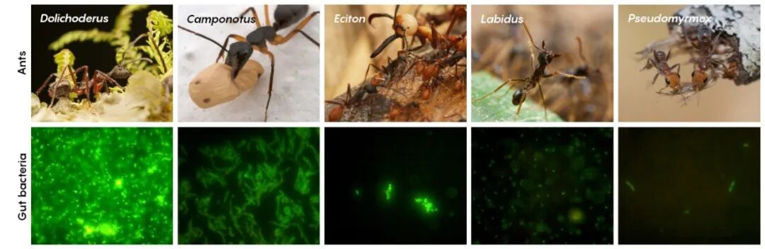 不同种类的蚂蚁有着不同丰度和类型的肠道菌群: 有些蚂蚁有着令人眼花缭乱的“细菌星系”;有些几乎不含没有任何细菌。图片来源:doi.org/10.1093/icb/icx088