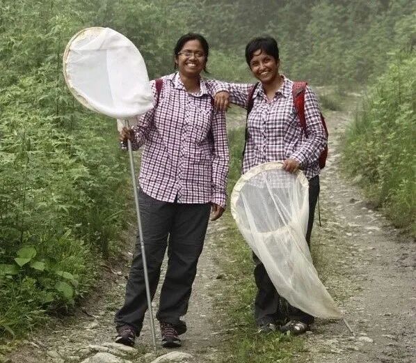 位于印度班加罗尔的国家生物科学中心的生态学家和进化生物学家 Deepa Agashe(右)和她的研究生 Kruttika Phalnikar 正在为他们的研究捕捉蝴蝶。他们发现扰乱昆虫肠道内的微生物种群对它们的生长发育没有影响。图片来源:Deepa Agashe