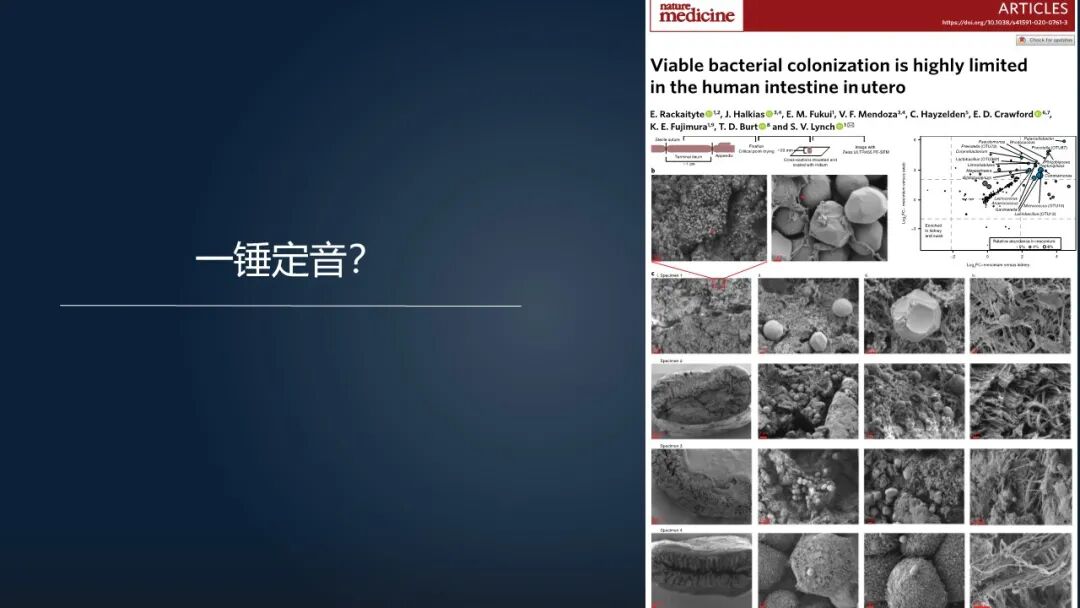 直到最近,2019 年发表在 Nature Medicine 上的一篇文章,它是不依赖于培养和这种测序的方法,直接通过电镜去观察胎儿的肠道之内到底有没有这种细菌样的这种结构。