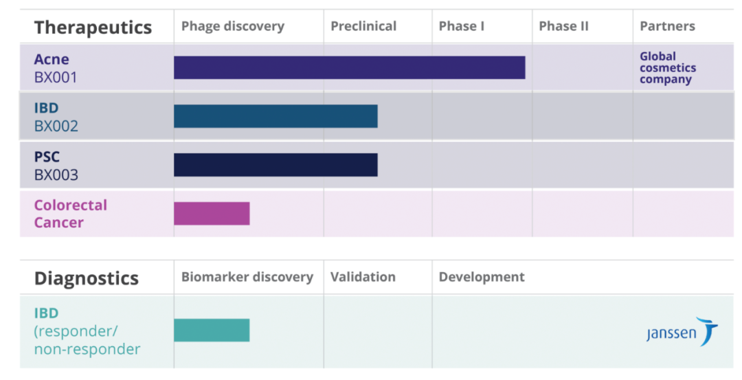 BiomX 公司正在研发的管线有 4 条,分别针对痤疮、炎症性肠病(IBD)、原发性硬化性胆管炎(PSC)和结直肠癌(CRC)。