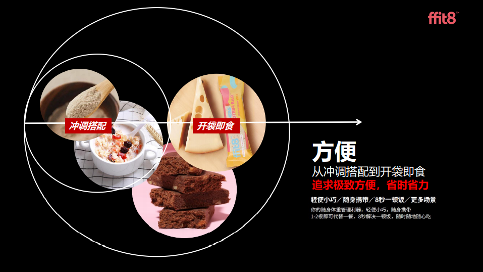 大家都知道蛋白棒这款产品,它其实原来的应用场景都是在运动健身前后,专业人士用来补充优质蛋白质的。我们 ffit8 从这个产品作为载体入手,把它推广到普通人群的需求里面。