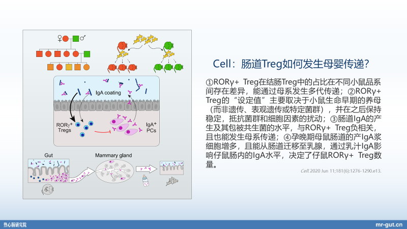 比如说我们的 IgA 在母鼠的这种体内,它可以去促进特定的 T 细胞产生,然后产生这种特定的抗体 IgA 的浆细胞,就会从肠道转移到乳腺当中,然后乳腺会把这样的浆细胞所产生的抗体——因为它在乳腺当中分泌这样的抗体了——传递给仔鼠,然后仔鼠的特定的 T 细胞就会受到抗体的调节。