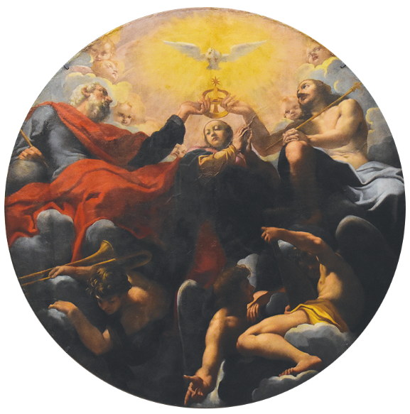 意大利费拉拉市的圣玛利亚大教堂的天花板是一块直径近 3 米的圆形帆布,帆布上描绘的是“圣母玛利亚被上帝、基督和圣灵加冕为天后”的情景。