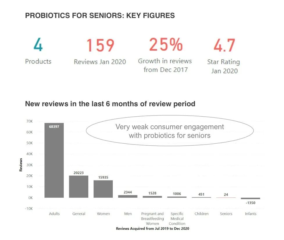总的来说,与老年人专用益生菌相关的评论数两年内增加了 700%以上。报告指出,老年人专用益生菌“与那些市场体系已经相对比较成熟的适用于普通人群的益生菌相比,这两年所受到的关注度已经多了 20%,这充分凸显了市场机会。”