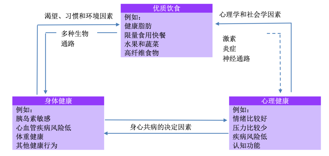 图1 .饮食、身体健康和心理健康之间的假想关系。虚线是本文的重点。