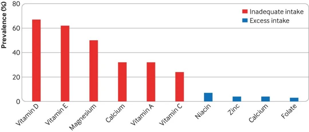 ●补充剂的使用显著降低了多种营养素摄入不足的流行率,但也增加了某些营养素摄入过量的比率。