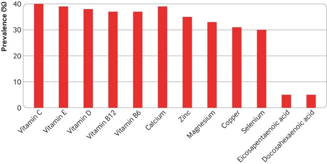 因此,补充剂的使用大大降低了普通人群中营养素摄入不足人群的比例(BOX 1),尤其是维生素和矿物质(如维生素 D 和钙),这些被认为是“短缺”的营养素(图 2)14。
