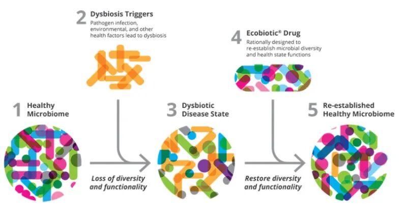 Ecobiotic 药物由共生微生物组组成,旨在推动微生物群落向健康状况过渡,从而治疗严重的人类疾病包括炎症、代谢和传染病等。