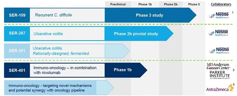 一款是与美国德克萨斯大学安德森癌症中心和 Parker 癌症免疫治疗研究所共同合作的改善免疫疗法治疗的癌症患者的微生物药物 SER-401,目前正在进行 1b 期临床研究。
