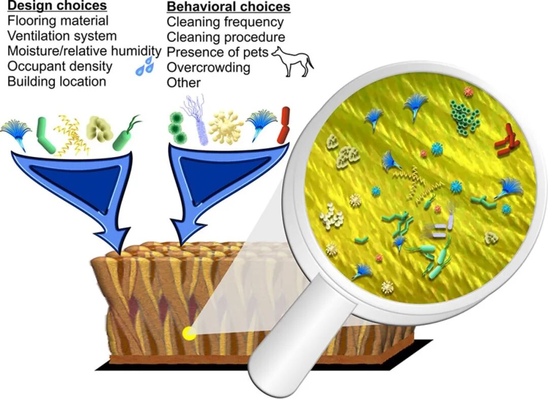 图 1. 室内微生物组包括了定居在我们家中的各种各样的微生物,如这张地毯图片所示。建筑设计方案的选择(如地板材料)和居住者行为的选择(如清洁频率)都会对我们与微生物的日常接触产生影响。
