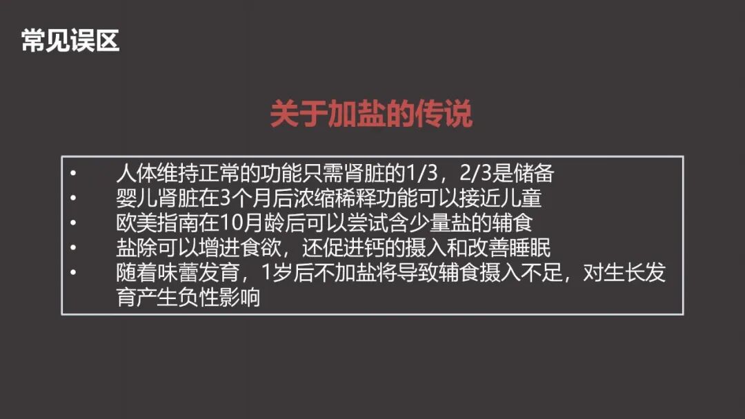 关于加盐的传说,为什么叫传说?是因为各种各样的说法太多了,我们在临床上几乎每个生长迟缓的孩子的家长来了之后都会问到关于加盐的问题,但实际上来讲,家长的顾虑有时候我们觉得是顾虑过了。