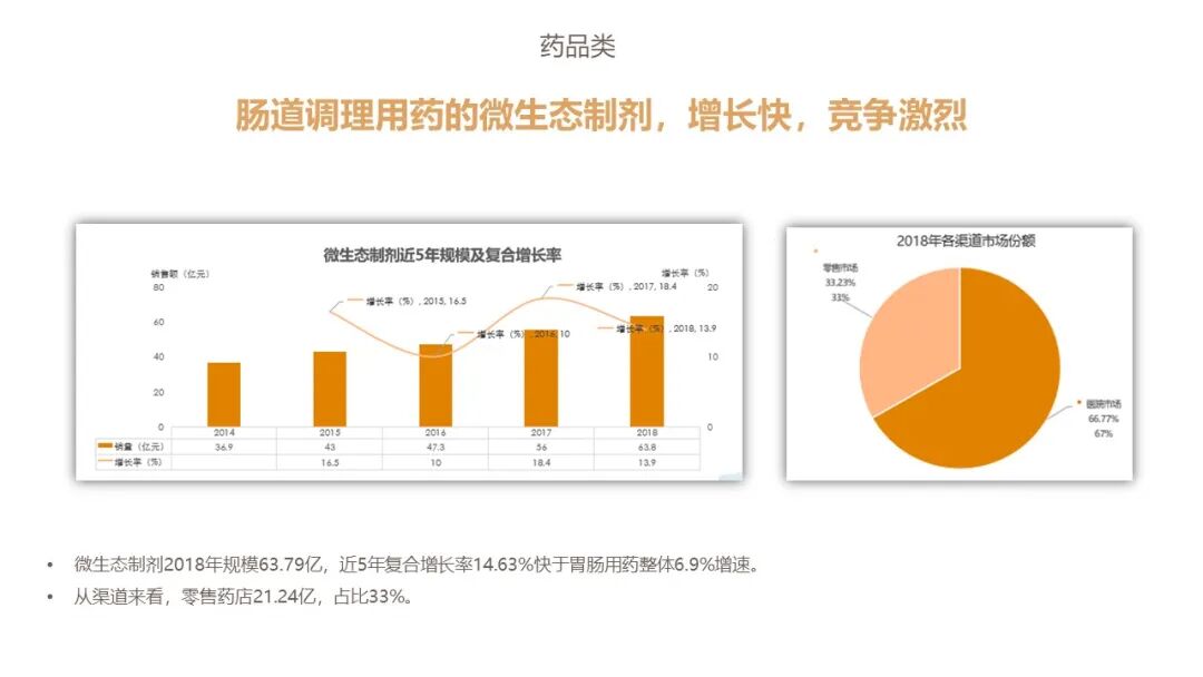 在药品类——微生态制剂的整个发展当中,这几年也一直呈增长的趋势。药品类的微生态制剂的这个产业规模,现在大概六七十亿左右。那么,我们可以看到,它近 5 年的复合增长率接近 15%,远高于我们整个胃肠整体用药的增长率,高出有一倍之多。