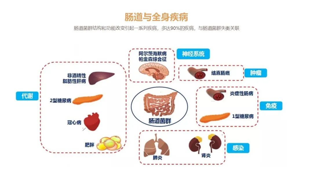 肠道微生态失调造成的肠道功能和结构的改变将引发一系列疾病。我们可以看到,包括我们的神经系统、我们的代谢系统、我们的肿瘤、感染、免疫系统等等。