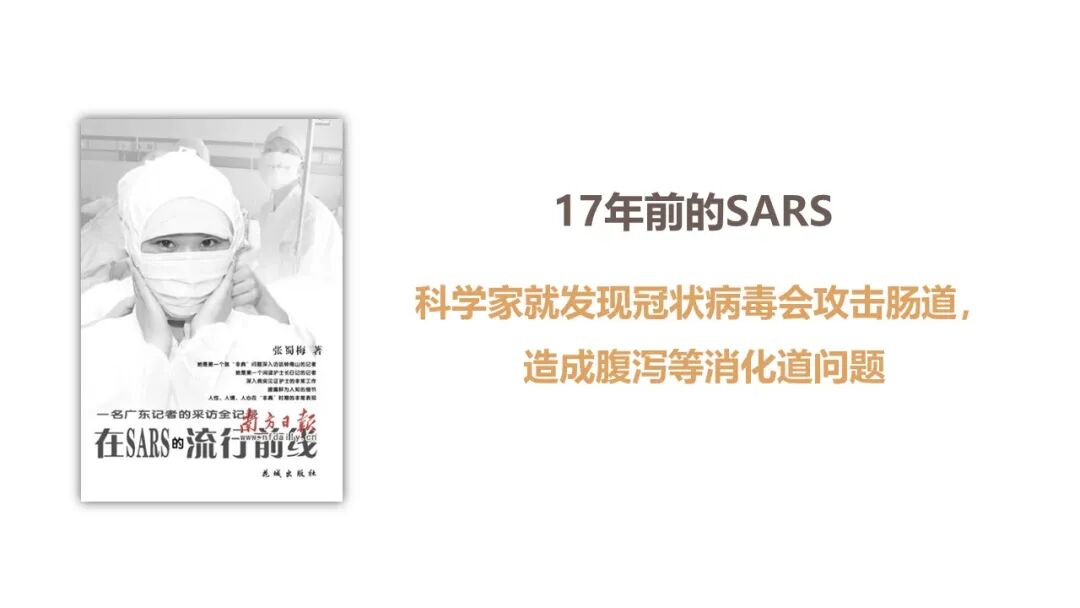 17 年前的 SARS 病毒,科学家就已经证明肺与大肠相表里。科学家发现当时的 SARS 病毒在攻击呼吸系统、攻击肺的同时,也会对肠道进行攻击,受损的肠道容易引发炎症以及消化道的系列疾病。