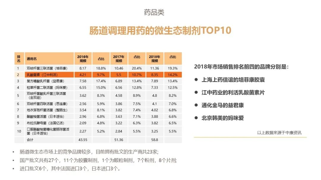 这一张我们看到的是药品类微生态制剂前 Top10 的名单,那么大家也可以看到来自江中药业的利活牌乳酸菌素片是位列第二。
