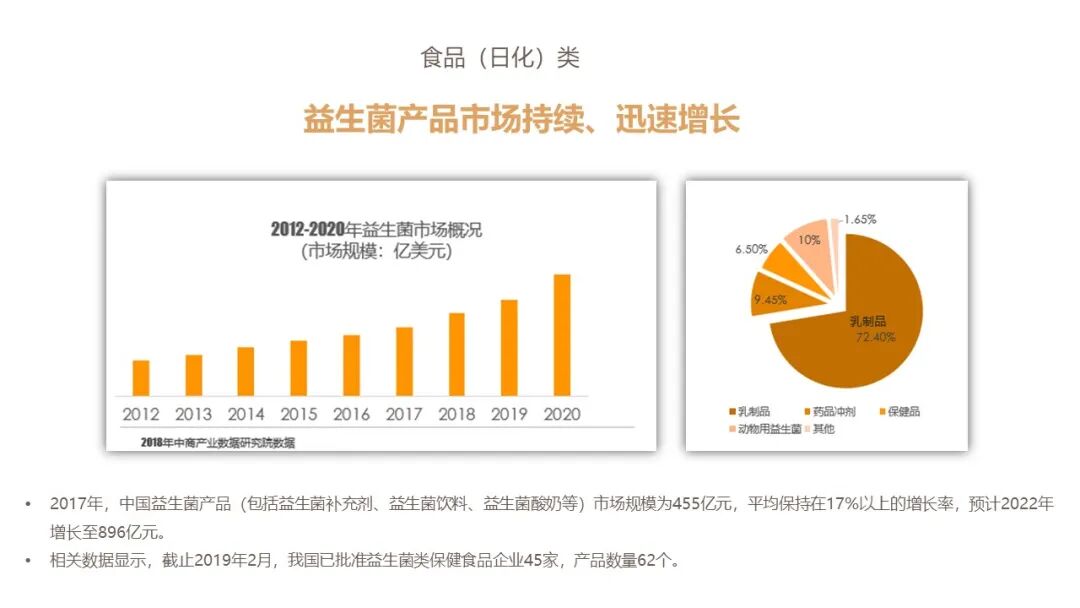 那么现在,我们的肠道大健康产业应该已经接近 1000 亿了,在整个 1000 亿的中国肠道产业的市场当中,当然,占据比例比较高的还是食品类的健康产品,包括我们的益生菌的酸奶,包括我们益生菌的固体饮料,也包括益生菌的一些补充剂。