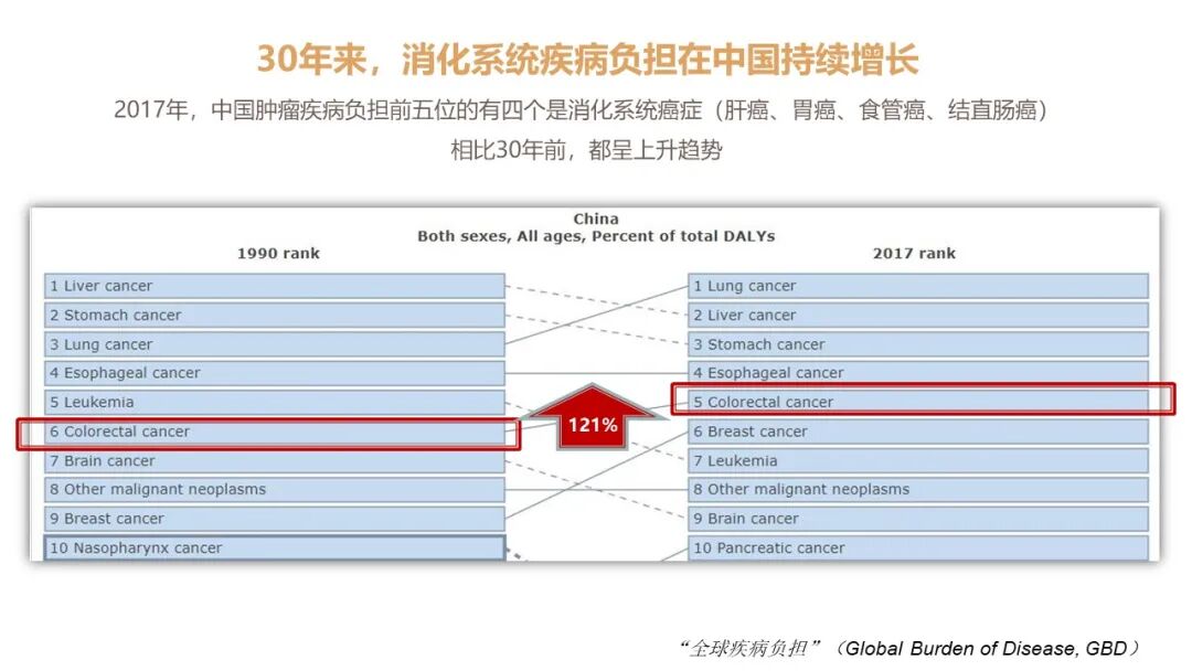 在中国的肿瘤疾病负担的前五当中,有 4 个都是消化系统的肿瘤,包括肝癌、胃癌、食道癌和结直肠癌。尤其是结直肠癌,我们这 30 年以来,它的整个排位从第 6 位上升到了第 5 位,而且整个疾病负担增长了 121%。