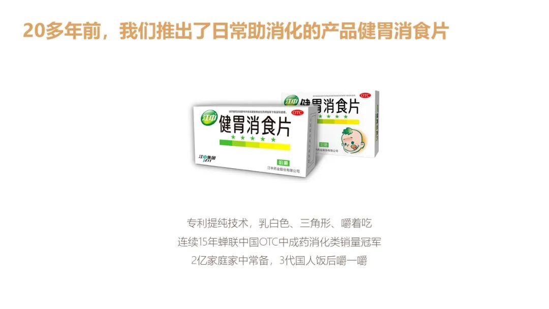 我们在 28 年前,推出了日常助消化的江中健胃消食片。这一江中消食片也是我国第一个过 10 亿的 OTC 单品。