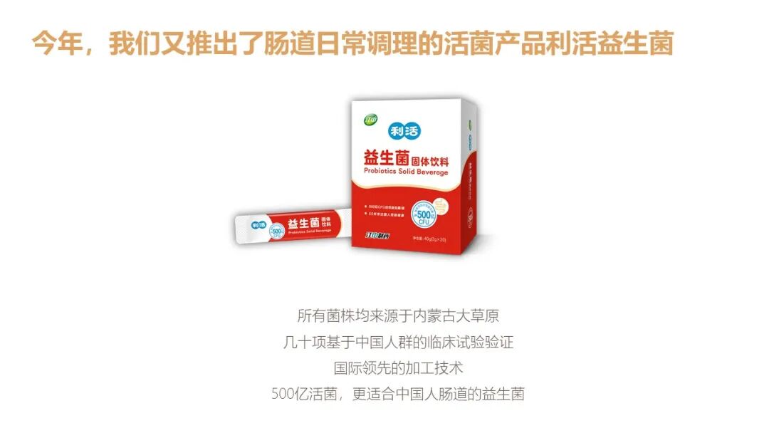 这一次随着新冠疫情,我们又推出了江中利活牌益生菌:500 亿活菌,全球领先的加工技术,所有的菌株都来自内蒙古的大草原,而且有几十项基于我们中国人群的临床试验验证。