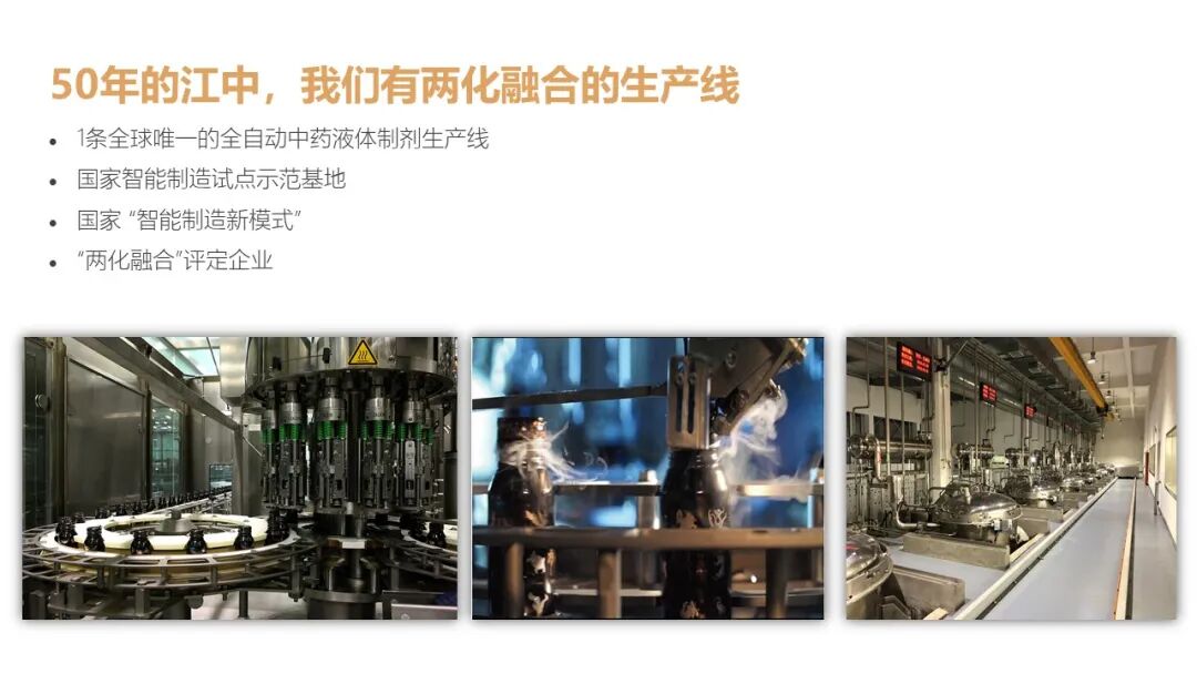 50 年江中制药,我们拥有两化融合的先进生产线,拥有全球唯一一条全自动的中药液体口服液生产线,我们也是国家的智能制造示范基地以及智能制造新模式单位,是“两化融合”的评定企业。