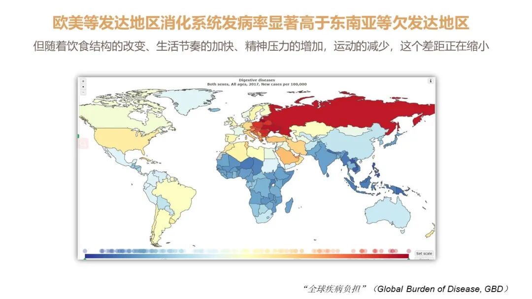我们可以在这张图谱中发现,欧美发达地区的消化系统的疾病的发病率明显高于像非洲、东南亚这样的一些地区,这可能与欧美发达国家他们的工作节奏、生活压力,尤其是偏肉食类的食物结构有关系。