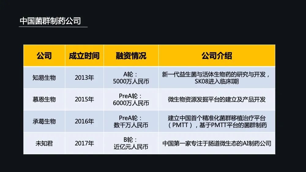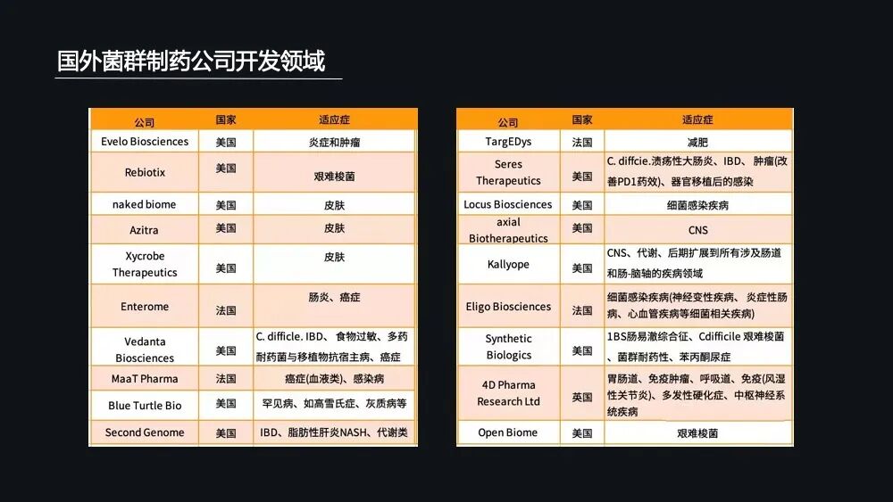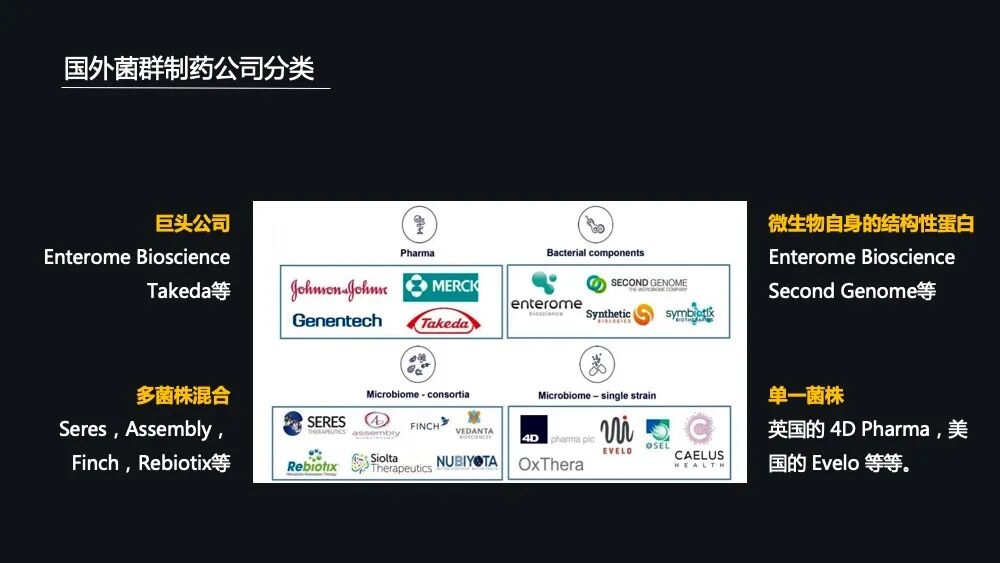 在这些国家微生物计划的推动下,尤其是美国——在有一整套完整的菌群制药的申报流程跟监管体系之下,涌现出了一大批的创业公司和药企——就是菌群制药公司。