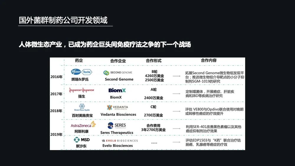 比如在 2016 年的时候,辉瑞和罗氏联合投资了 Second Genome,主要是在研发菌群所能介导的这一些靶点抑制剂的一个疗效。