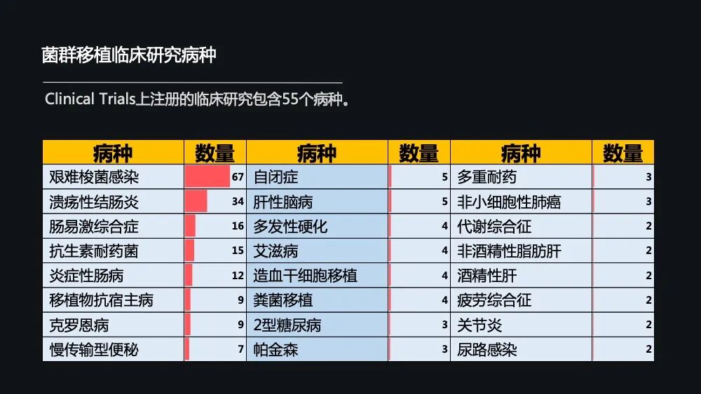那在这 200 多项的一个临床研究中,包含了 55 个病种,最多的当然是艰难梭状杆菌感染,其次是溃疡性结肠炎和肠易激综合征。