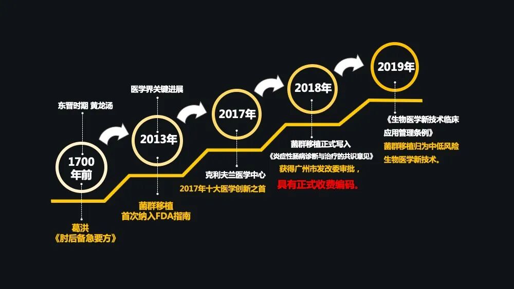 到了 2018 年,广州市发改委的一个审批使菌群移植具有了正式的收费编码,这是中国在菌群移植这个行业中,将菌群移植定义为医疗新技术的一个里程碑事件,因为它同时具备了菌液制备以及菌群移植技术两条收费编码。