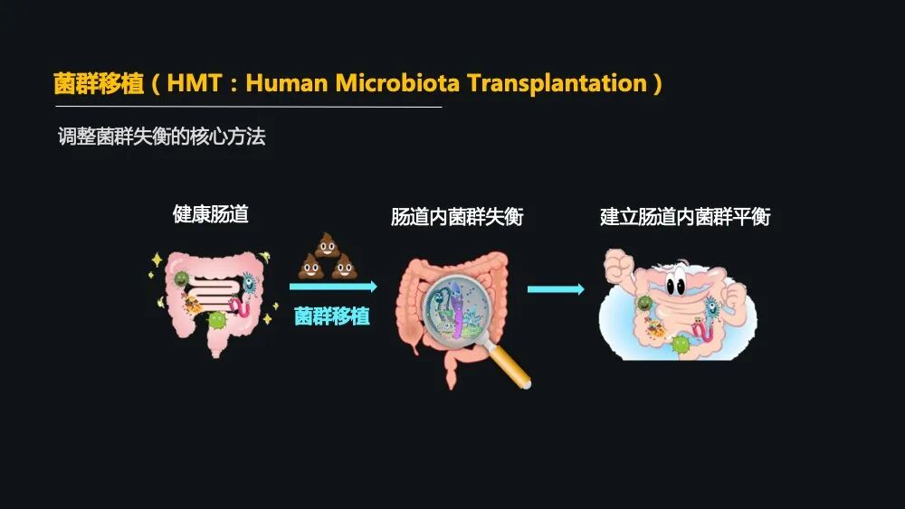 菌群移植作为调整菌群失衡的核心方法,它指的是将提取自经过严格筛选的供体中的肠道菌群制备成菌液或者胶囊,移植到那些肠道菌群失衡的患者体内,重建患者肠道菌群的一个平衡,来达到治疗疾病的一个目的。
