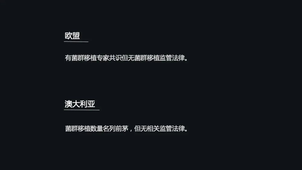 在欧盟,2017 年的时候就已经发布了菌群移植的一个专家共识,但是至今还没有明确的监管法律。