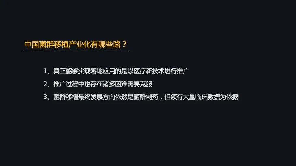 那么在这种整体的监管情况下,我们中国菌群移植的产业化有几个方向。