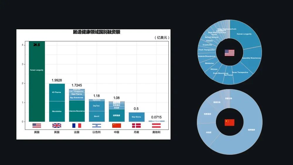 这些图中展示的是全球各个国家在微生态健康产业的一些融资的情况。美国以 24.5 亿美元居首,占了全球 80%的融资额度。