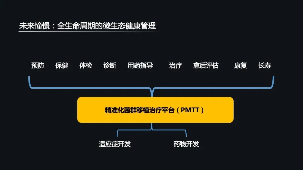 最终我们期望能够实现的是疾病的预防、保健、诊断、用药、治疗、愈后评估、康复、长寿为一体的全生命周期的微生态健康管理。