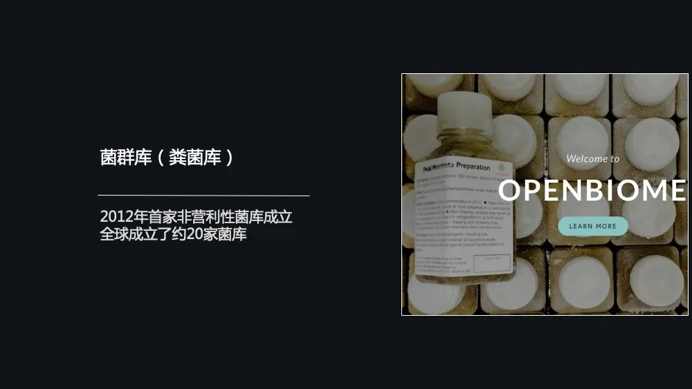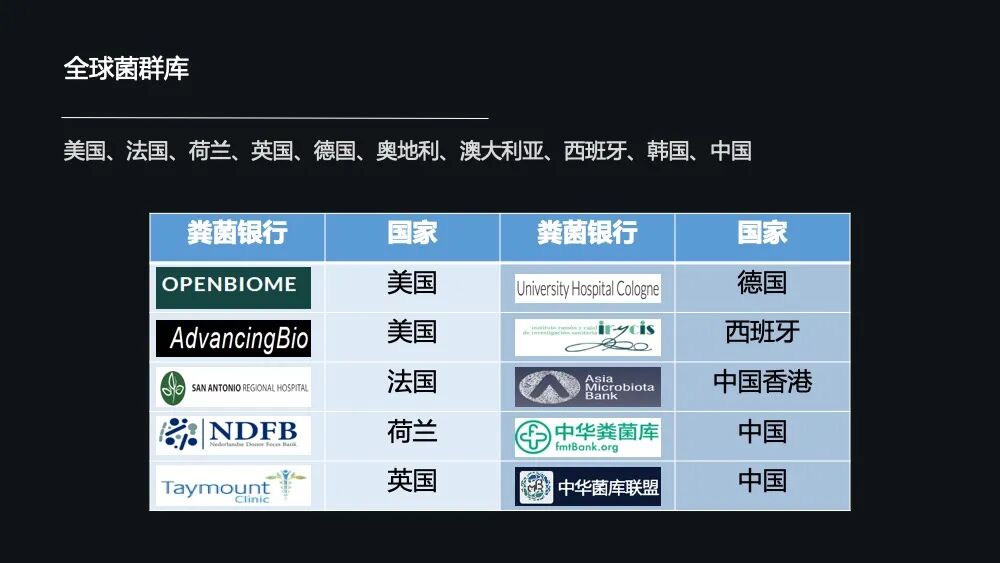 比如像美国的 OpenBiome、法国的圣安东尼奥医院菌群库、荷兰的莱顿大学医学中心的菌群库、英国的 Taymount 医疗中心的菌群库以及德国的科隆大学的医院的菌群库,还有中国的中华粪菌库。