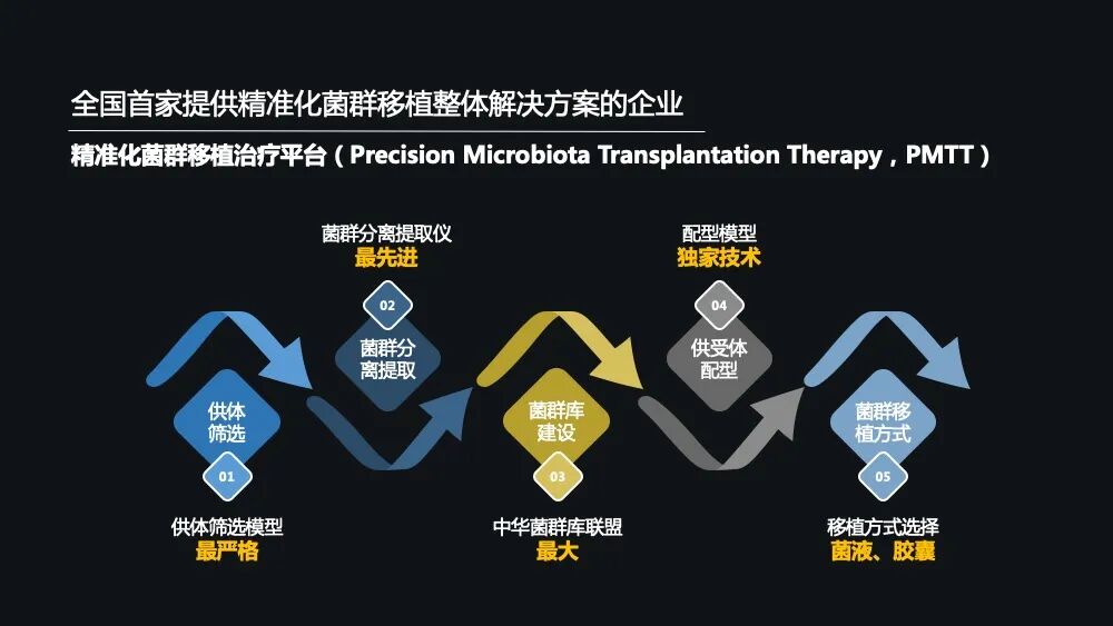 而承葛生物它是建立了中国首个精准化菌群移植治疗平台,它的产品涵盖了上游的仪器和耗材,中游的菌液跟胶囊,下游的供受体配型跟整体的菌群库建设的一个解决方案,并且基于 PMTT 平台,开启了微生态制药之路。