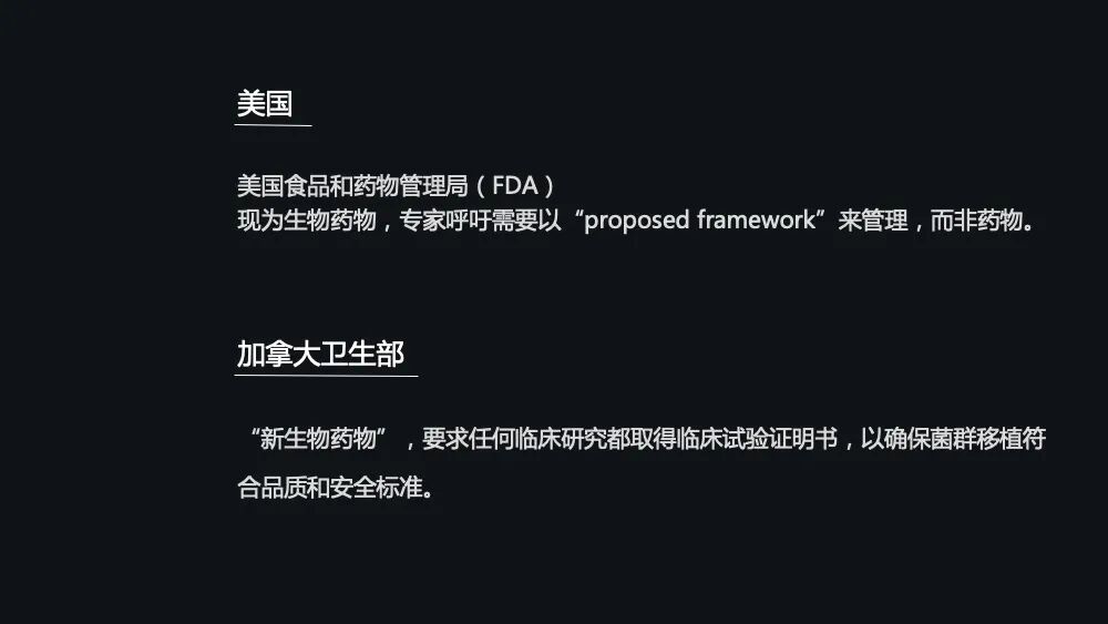 那既然菌群移植在国内外都如火如荼地开展,它的监管又如何呢?到底是按照技术来监管,还是按照药物来监管?我们先来看一下国外。