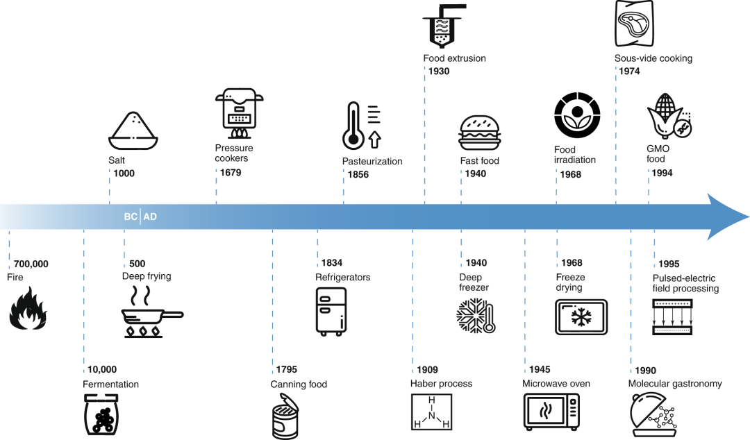 图 1 | 食品技术的历史时间表:一些食品技术(如基因技术和食品辐照技术)遭遇了很强的阻碍,而其它技术(如冰箱和冷冻干燥技术)已被广泛接受。与其他领域不同的是,新的食品技术并不会完全地改变旧技术。因此,接受创新技术的压力要小得多。图片来源:www.flaticon.com