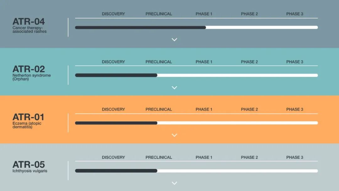 目前,Azitra 公司有 4 条产品管线,分别是针对特应性皮炎的 ATR-01、针对 Netherton 综合征的 ATR-02、针对癌症治疗相关皮疹的 ATR-04 和针对寻常鱼鳞病的 ATR-05。