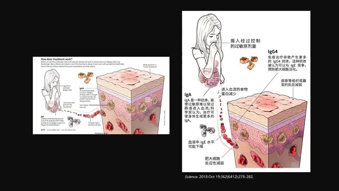 当然另外也发现通过过敏原的刺激可以产生 IgG4,这样使得 IgG4 能够去跟 IgE 去竞争,竞争的过程也使得过敏反应能够下降。