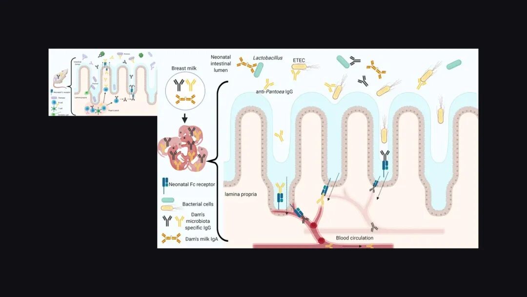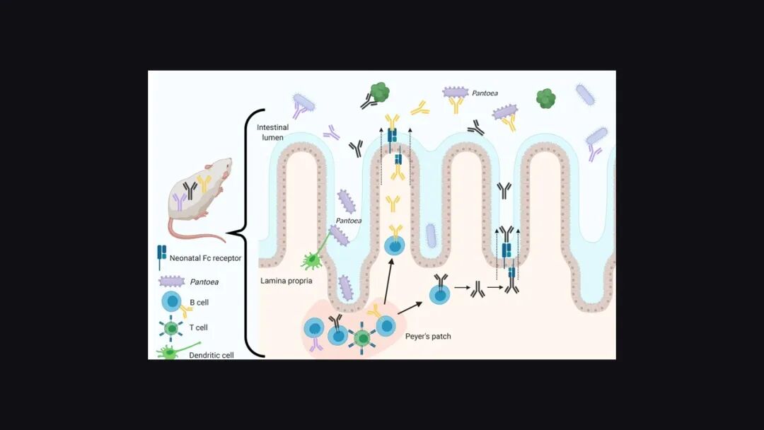 肠道菌群正常的孕鼠体内会有一个叫 Pantoea 的细菌,这种细菌能够诱导产生出一个特定的 IgG 抗体,这个抗体会随着母乳进入到幼鼠的肠道,在肠道当中它会去抵抗肠产毒性大肠杆菌的攻击。